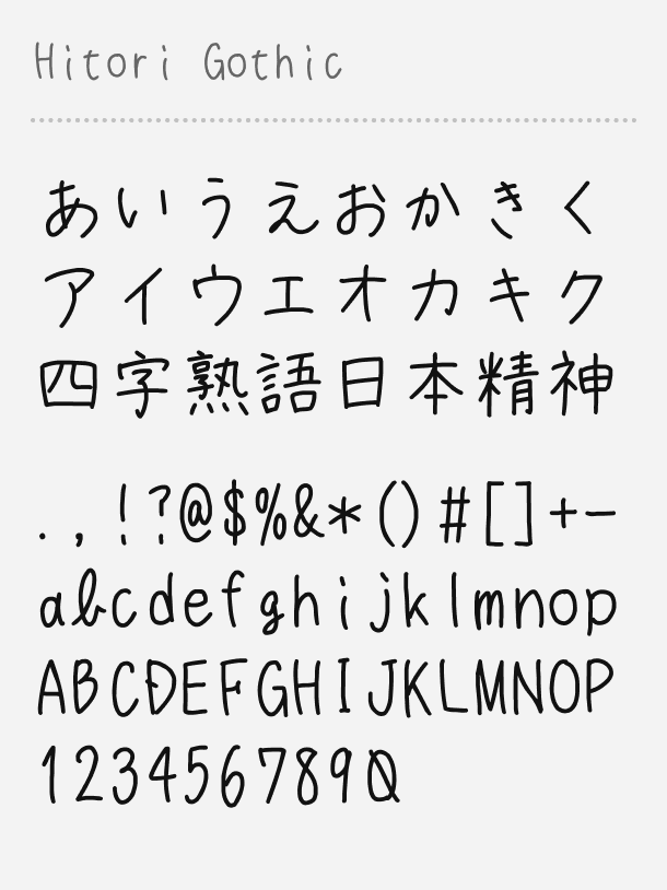 Hitori Gothic (ひとりゴシック) is a conventional, clean looking handwriting style Japanese font for free download. It was created by hand…